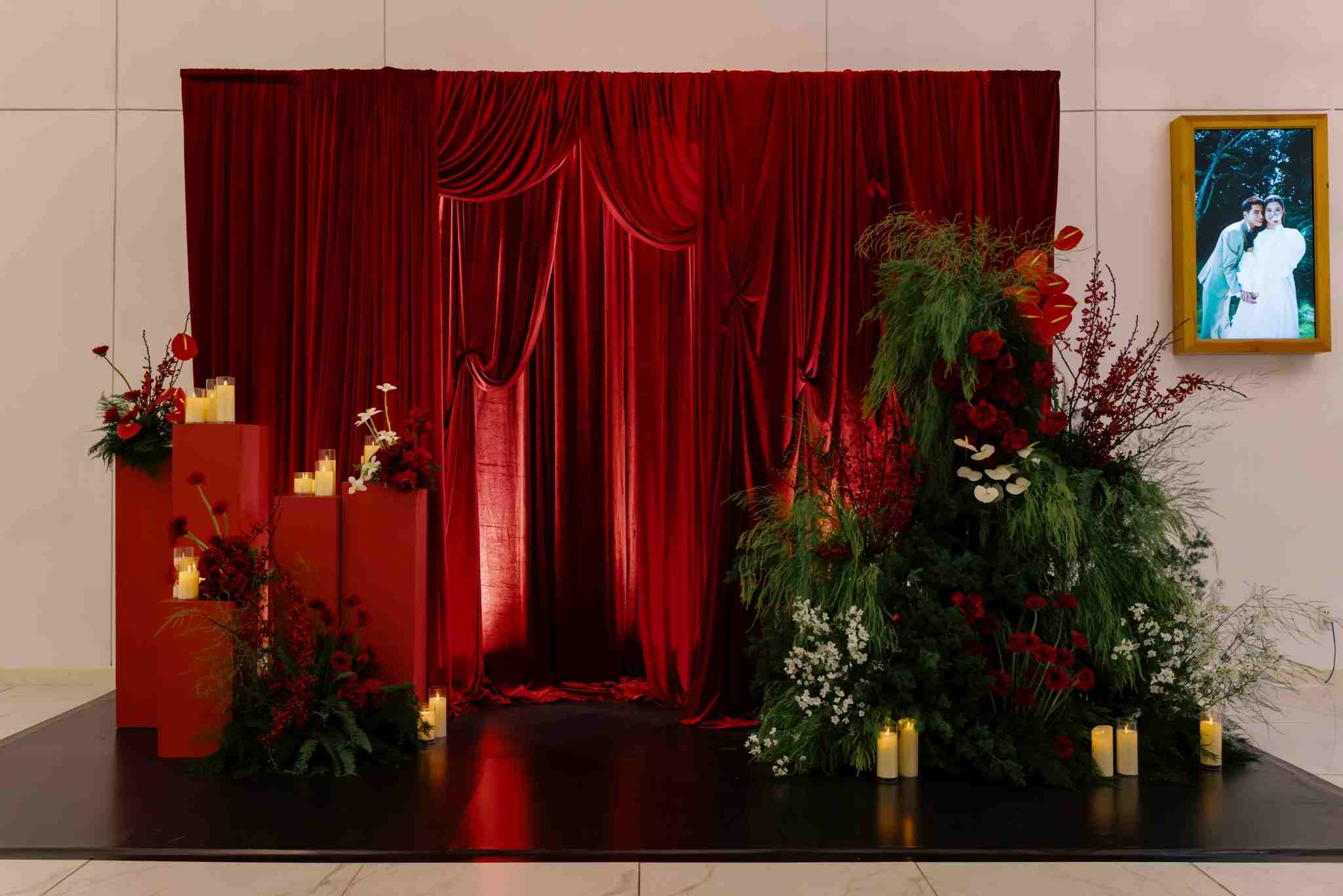 01. Backdrop đỏ kết hợp giữa vải nhung và hoa