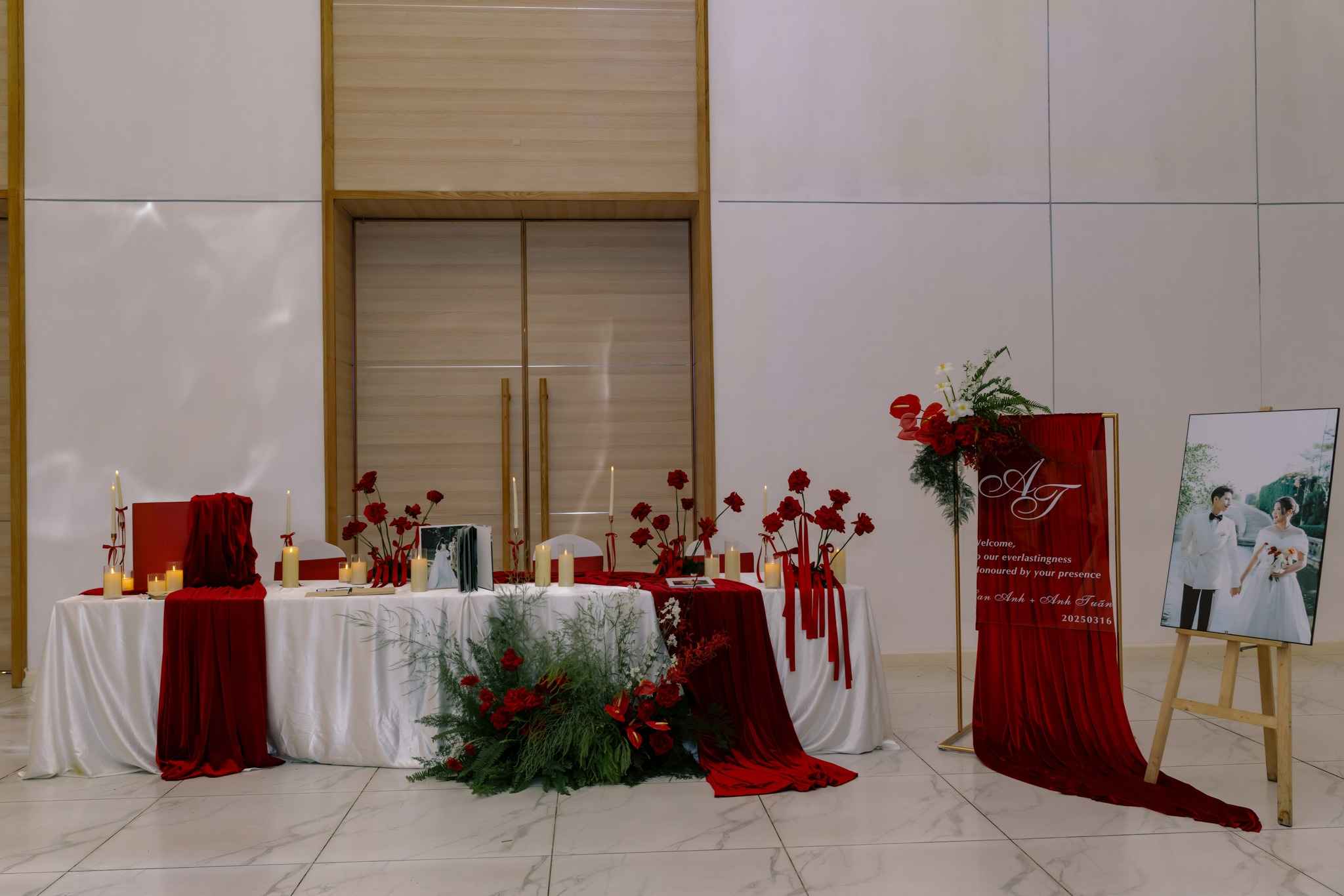 Backdrop đỏ hòa cùng vải lụa tăng thêm độ sang chảnh