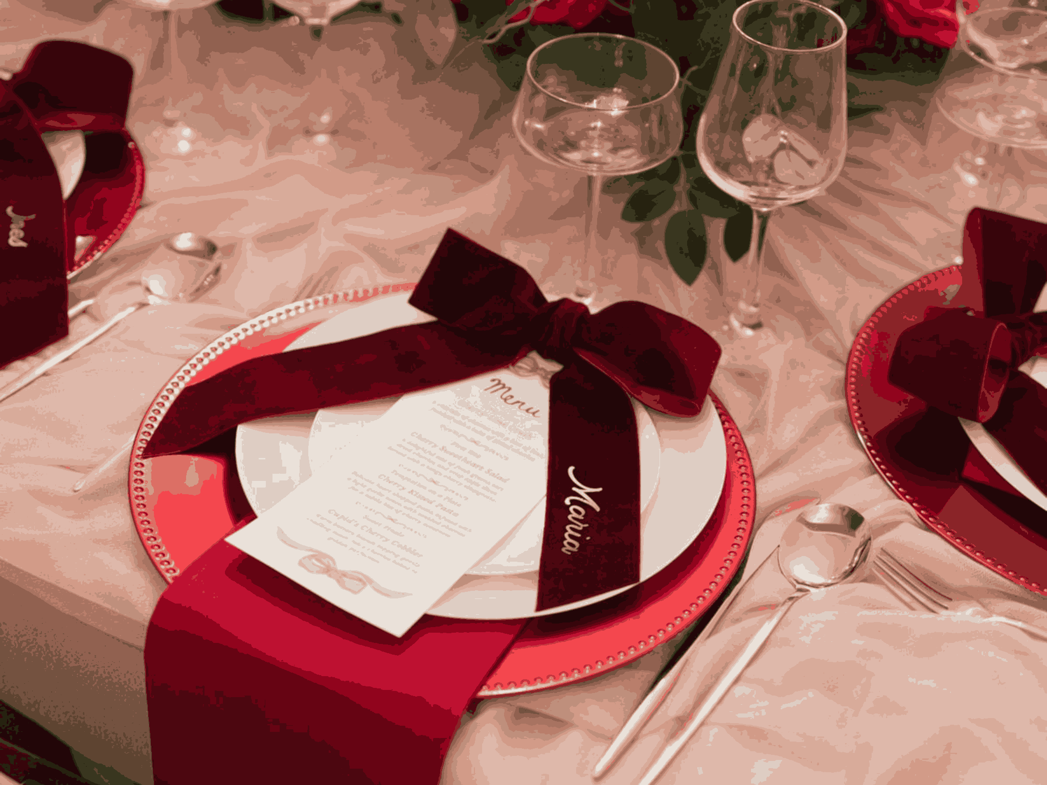 Để đồng bộ hóa toàn bộ concept tiệc cưới, cô dâu chú rể có thể lựa chọn đĩa trắng làm nền, sau đó nhấn nhá bằng nơ vải lụa đỏ cherry đặt khéo léo trên khăn ăn. Bên cạnh đó, hãy đề nghị nhà hàng thiết kế menu tiệc với tông đỏ đồng điệu, in nhũ vàng hoặc dập nổi để tăng phần sang trọng.
