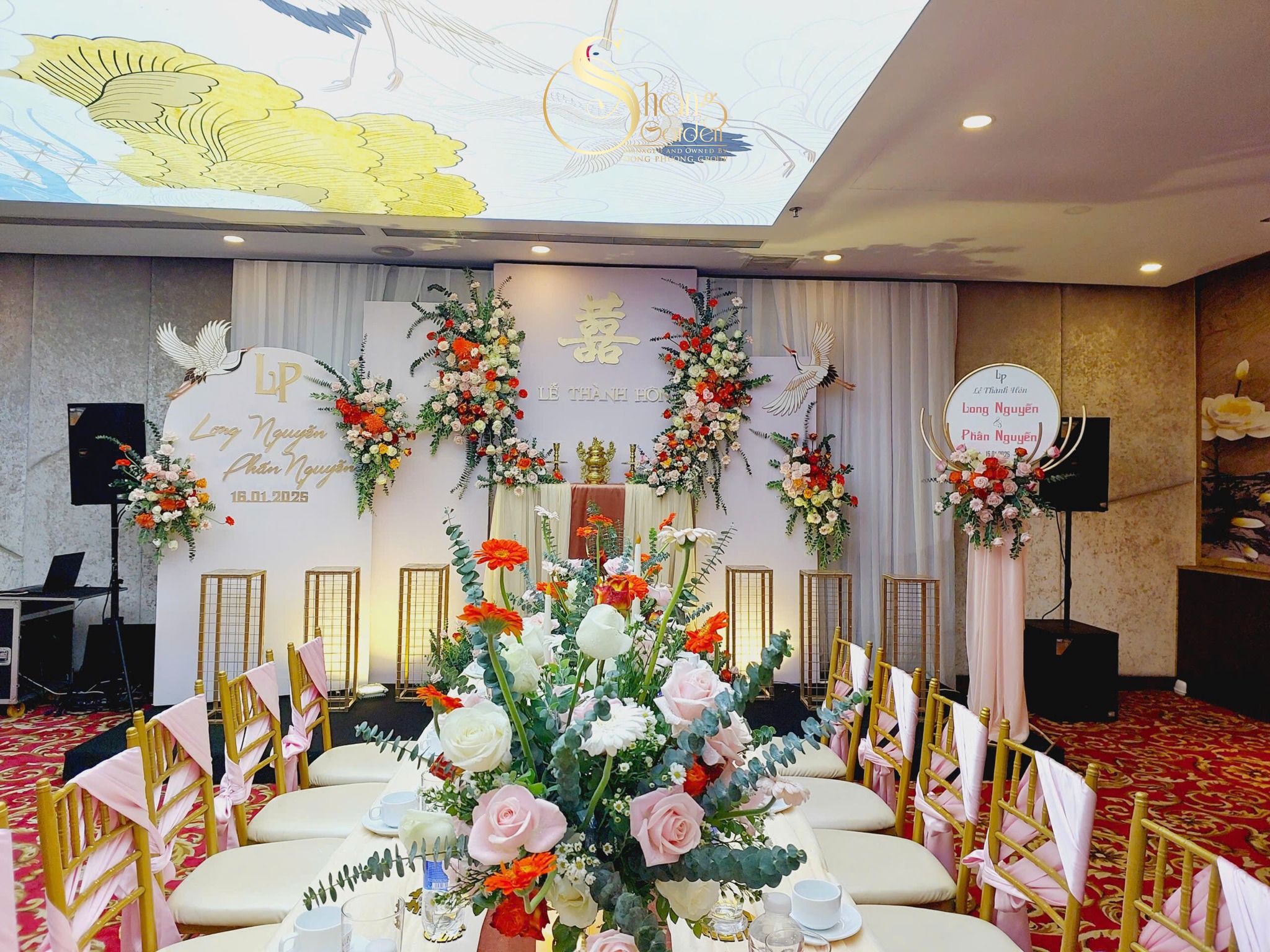 Tại Shang Garden, lễ gia tiên được tổ chức trong không gian mang âm hưởng Á Đông. Giao thao giữa truyền thống và sự hiện đại, phù hợp cho cặp đôi yêu thích văn hóa phương Đông.