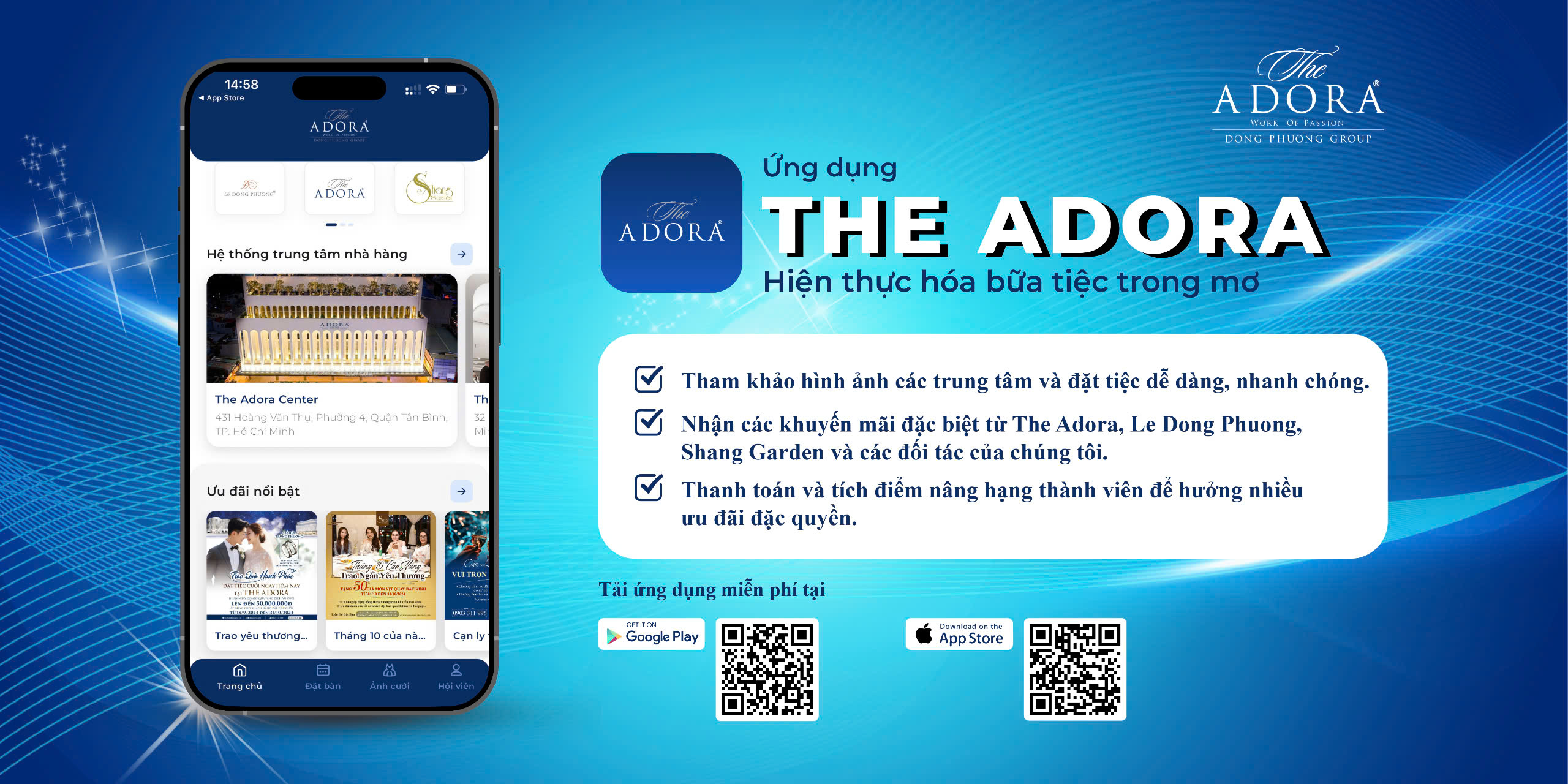 Bằng cách tiên phong ứng dụng công nghệ chuyển đổi số, Dong Phuong Group một lần nữa khẳng định vị thế dẫn đầu trong ngành dịch vụ mến khách suốt hơn 28 năm qua. Ứng dụng THE ADORA là một trợ thủ đắc lực, giúp khách hàng tiếp cận nhiều tính năng hữu ích: đặt bàn, tìm kiếm địa điểm tổ chức sự kiện, nhận các chương trình khuyến mãi đặc biệt và tích điểm nâng hạng thẻ thành viên để hưởng các ưu đãi độc quyền.